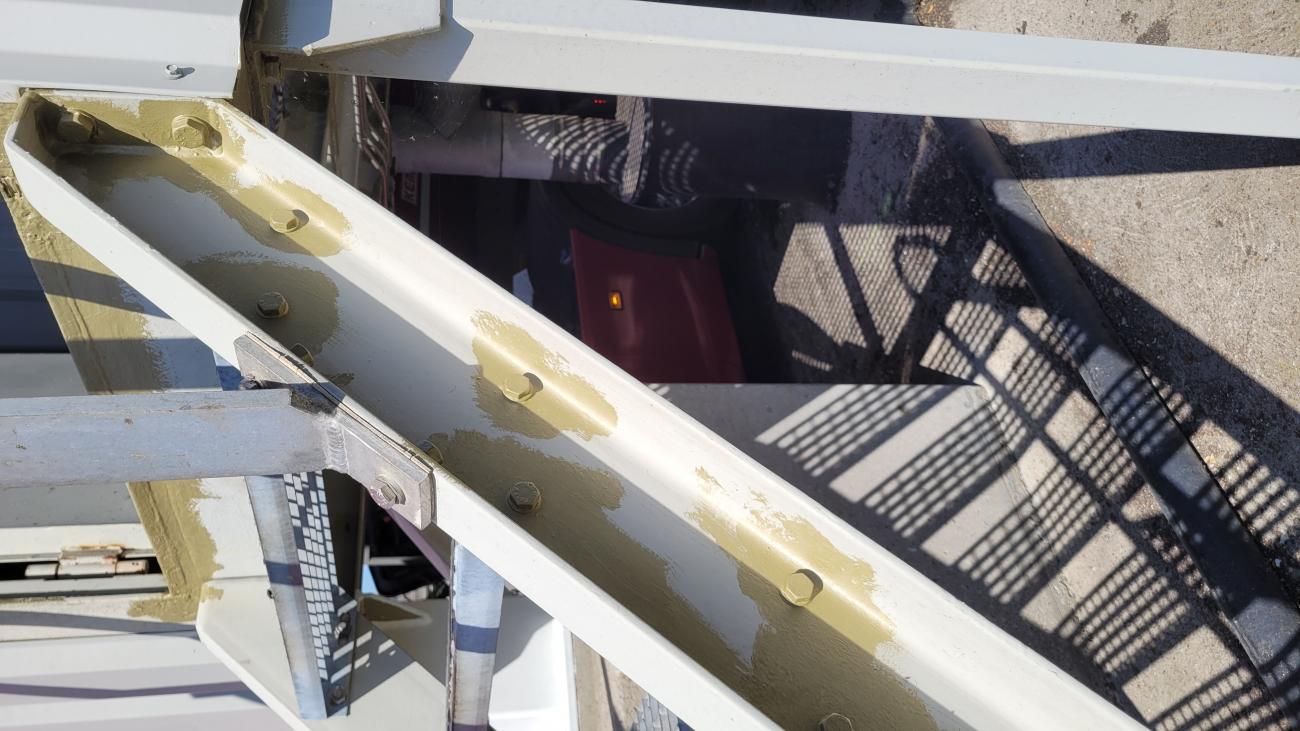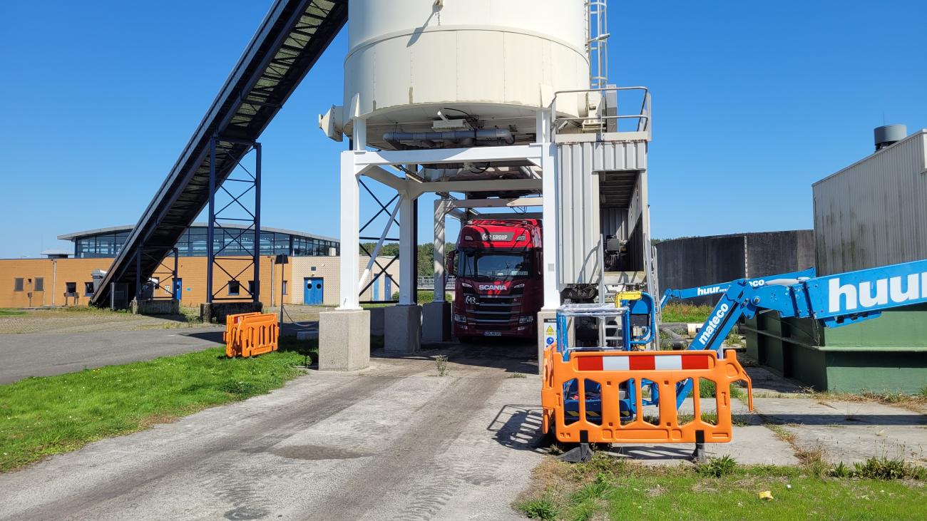 Het slib dat overblijft na nadat riool water gezuiverd is wordt verzameld in deze silo en dagelijks afgevoerd wordt. Dit proces ging ook door tijdens het werk. Hiermee moest er tijdens het werk rekening gehouden worden. Op de punten waar de jukken op de poeren staan en verbonden zijn met de silo was enige roestvorming aanwezig. Dit is verwijderd en het geheel is voorzien van een 2-componenten verfsysteem.